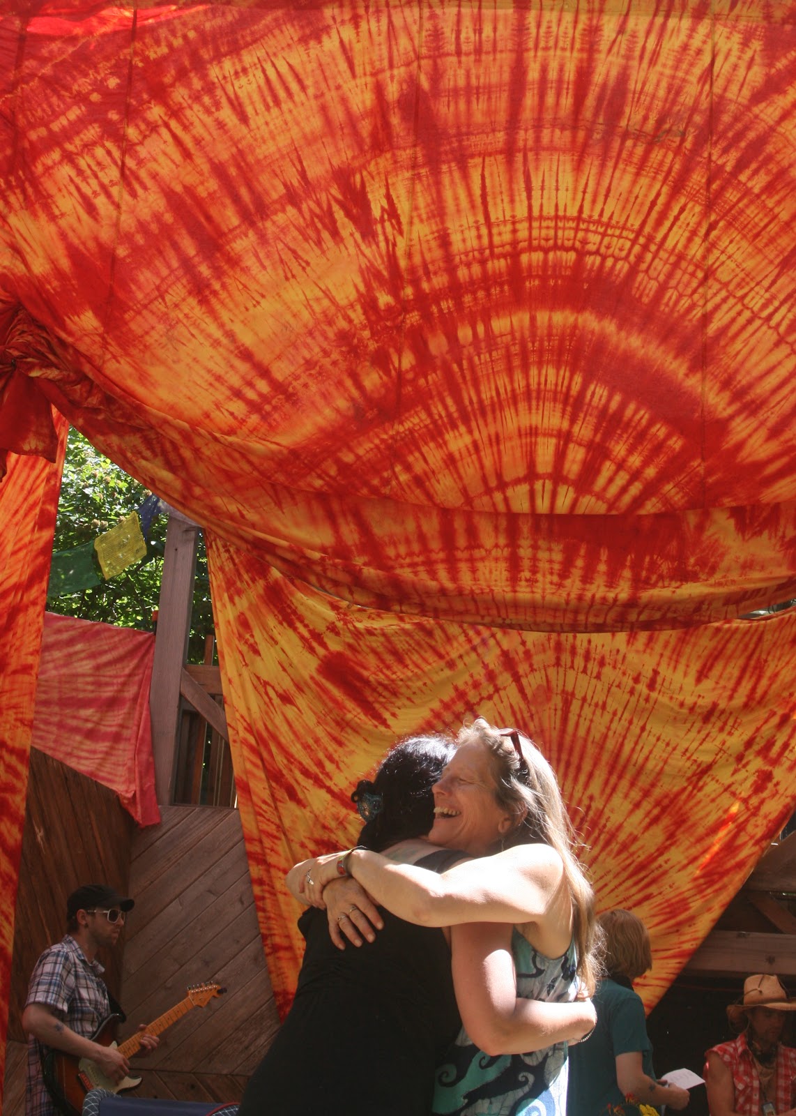 My nephew (face painted like a pirate) and Miss E (did not want her face painted but finally took her shirt off after complaining about "dying" of heat and I pointed out that this was one place where she really could go topless if she wanted to). Side story: While walking around we ended up behind a naked guy (kind of rare here) with leaves taped in front. Despite all our efforts to subtly speed up or slow down to let him pass, we all ended up walking the same speed for a bit. Miss E and my nephew were giggling to each other but were doing it with hands over their mouths and quietly. I was touched that they were being thoughtful in what was arguably, a difficult situation for a 7 year old not to giggle out loud at. Before the fair I didn't talk to them at all about how to act or what they might see, figuring I'd deal with it if it came up and I guess that worked. Plus, who wouldn't giggle a bit at a naked man with no body paint walking around a festival?
